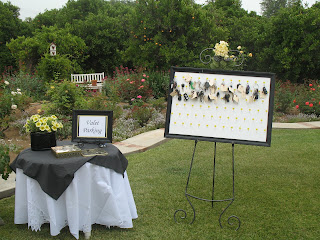 Back to our tour through the garden...As we continued on the pebble pathway through the garden, we entered through a gate into the backyard, where the the tea was to be held. The tables were gorgeous. There were round tables, adorned with pale yellow table clothes and accented with black, white, and more yellow. Those colors together are simply beautiful. Fresh yellow roses and white petite daisies were the center pieces.